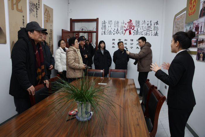 采风团首站走进铁林人民法庭,在讲解员的引导下,依次观摩了从一楼至四楼精心打造的文化墙,主题鲜明的文化墙串联起法治理念与为民情怀,让每一处空间都浸润着浓厚的法治文化氛围。在“张淑霞法官工作室”,作家们聆听她如何将矛盾化解在基层,如何在“枫桥经验”的土壤中,种出有温度的法庭文化。随后,采风团走进铁力市人民法院,参观诉讼服务中心与不同规模的审判庭,切身感受了现代化诉讼服务设施与多元审判空间的建设成果。