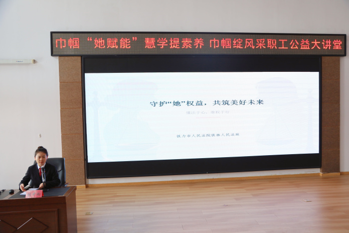 为进一步提升广大妇女的法律素养和维权意识,赋能女性成长与发展,近日,铁力市人民法院法官张中瑞应市妇女联合会邀请,走进“职工公益大讲堂”,为来自全市社会各界的100名妇女代表带来了一场主题鲜明、内容丰富的法律知识讲座。